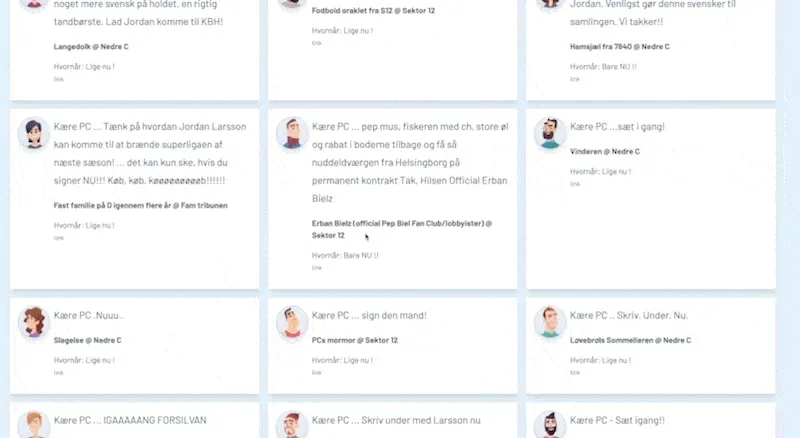 Netlify som sitet er hostet på gemmer formdata som CSV som let kan formateres til JSON. Så via 11ty pagination Krydret med lidt tegnede brugerprofilbilleder jeg havde liggende så lignede det jo noget.